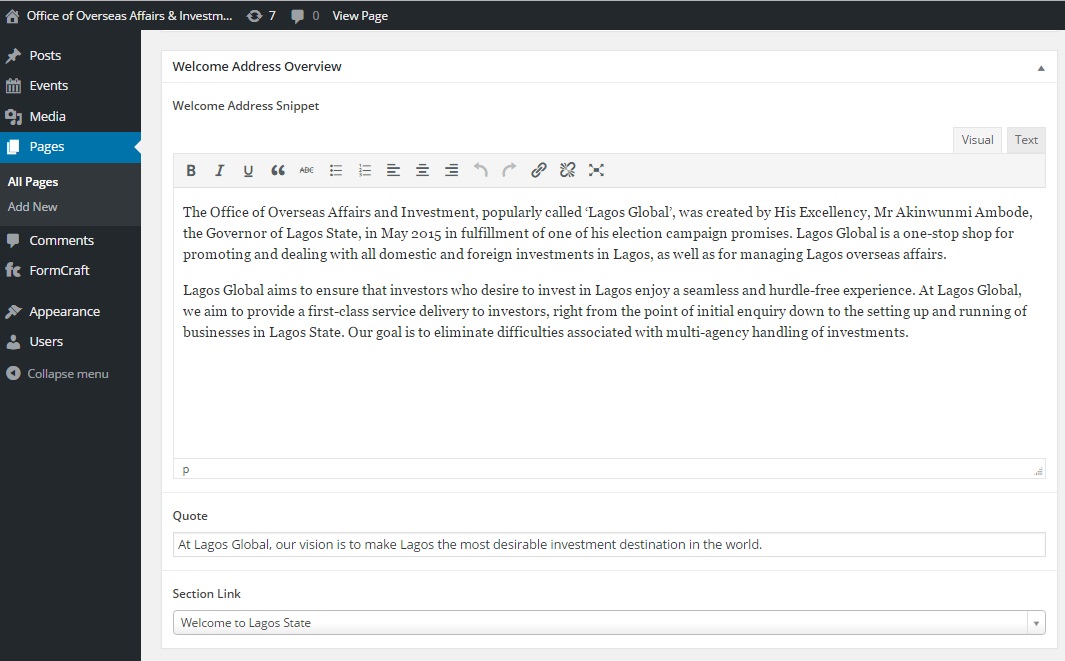 It contains the Content Text, Quote and Section Link. To change any part of the welcome address section, you edit the corresponding row and update.