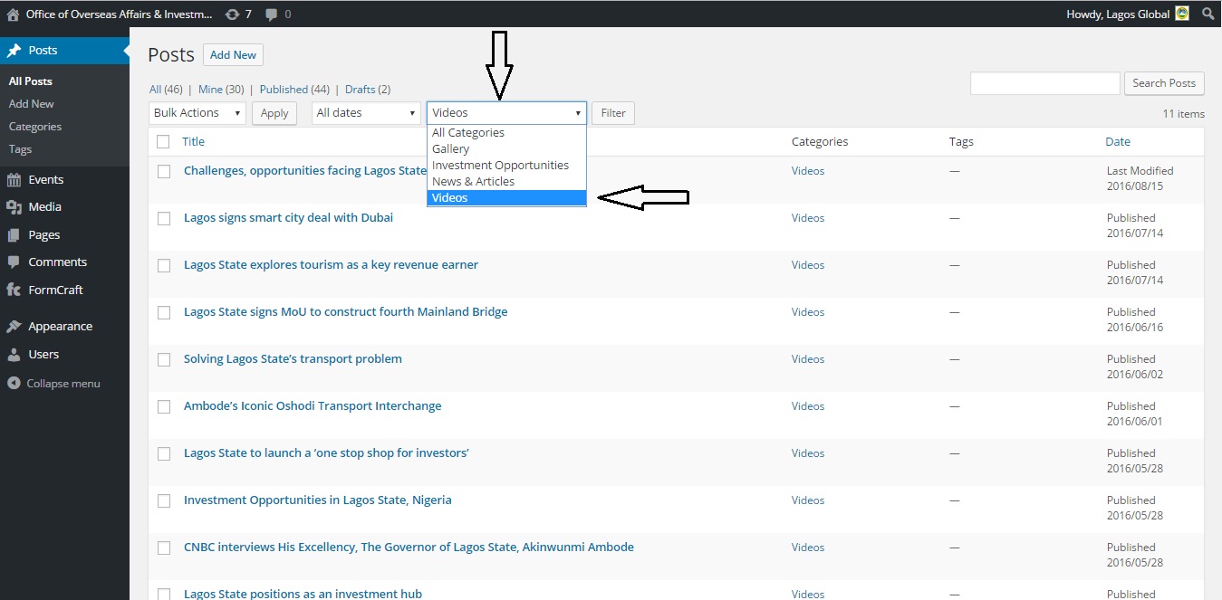 Click on the Categories drop-down menu and select Videos to filter the posts. Then click the 'Filter' button to complete.