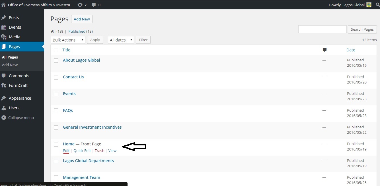 Click on the Pages tab to reveal all the pages that make up the website. This shows the name of each page and the date it was published.